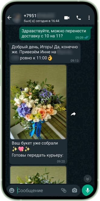 По вашему запросу покажем готовый букет на фото в WhatsApp перед передачей курьеру. Если какого-то цветка не окажется в наличии, то предложим вам варианты на выбор и согласуем с вами итоговый вид букета.