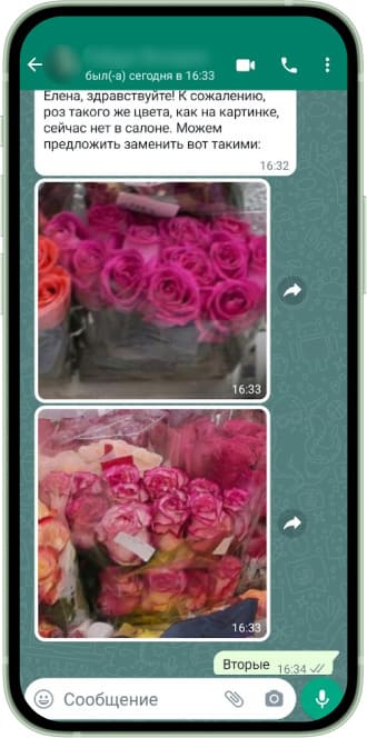 По вашему запросу покажем готовый букет на фото в WhatsApp перед передачей курьеру. Если какого-то цветка не окажется в наличии, то предложим вам варианты на выбор и согласуем с вами итоговый вид букета.
